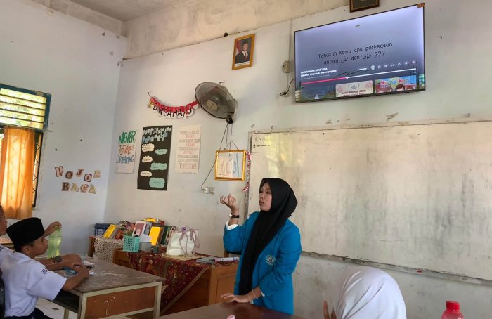 Dalam pelajaran yang berlangsung pada pagi hari tersebut, Husnaida menggunakan Smart TV untuk menampilkan berbagai materi audio-visual, seperti video interaktif dan latihan mendengar. Melalui pendekatan ini, suasana belajar di kelas menjadi lebih hidup dan menarik perhatian siswa. Para siswa tampak antusias, khususnya saat mereka diajak menirukan pelafalan kosakata baru yang ditampilkan secara visual dan didengar secara langsung melalui perangkat tersebut.
