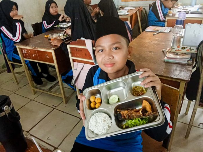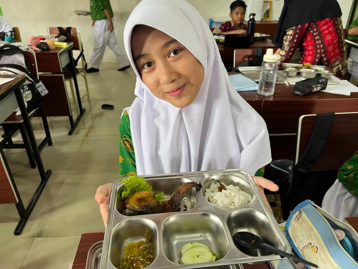 MBG menjadi salah satu agenda rutin yang cukup dinantikan oleh siswa. Selain sebagai ajang untuk mempererat hubungan antarsiswa, kegiatan ini juga memberikan pengalaman makan bersama yang penuh kegembiraan. Pada kesempatan kali ini, menu yang disajikan terdiri dari nasi, lele goreng, tahu goreng, sambal cabai hijau, lalapan daun selada dan timun, serta buah kelengkeng sebagai hidangan penutup.