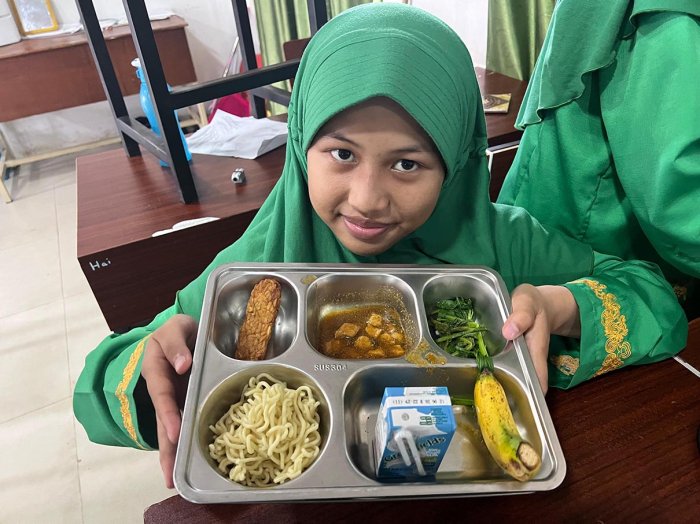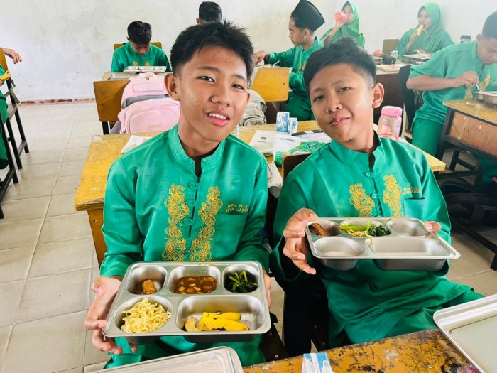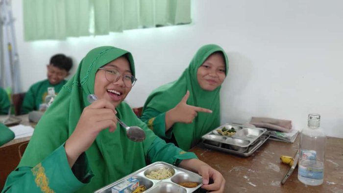 Kota Jambi (MTsN 2) - Keceriaan dan antusiasme menyelimuti ruang kelas 9B, 9K, 7K, dan 7F MTsN 2 Kota Jambi pada Jumat pagi saat program Makan Bergizi Gratis (MBG) kembali digelar. Kali ini, para siswa menikmati sajian spesial berupa mie ayam dan tempe goreng yang menggugah selera, dilengkapi buah pisang segar dan susu kotak sebagai pelengkap gizi.