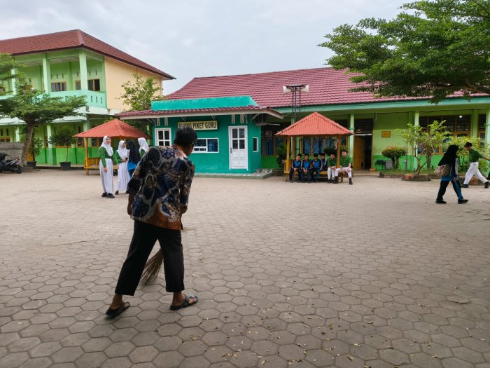 Sejak pagi, para petugas kebersihan terlihat menjalankan tugas mereka dengan penuh tanggung jawab. Mereka membersihkan halaman, merapikan taman, dan memastikan seluruh area madrasah tetap terjaga kebersihannya. Kehadiran para petugas kebersihan ini menjadi bagian penting dalam menciptakan lingkungan belajar yang nyaman dan sehat bagi seluruh warga sekolah.