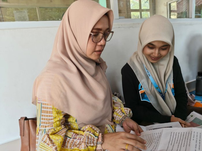 Kota Jambi (MTsN 2) - Guru pamong MTsN 2 Kota Jambi, Rabi‘ah Salim, S.Pd.I., M.Pd., memberikan bimbingan kepada mahasiswi Pengenalan Lapangan Persekolahan (PLP) dari Universitas Islam Negeri Sulthan Thaha Saifuddin (UIN STS) Jambi), Fhara Putri Utami, pada Jumat (10/10/2025).