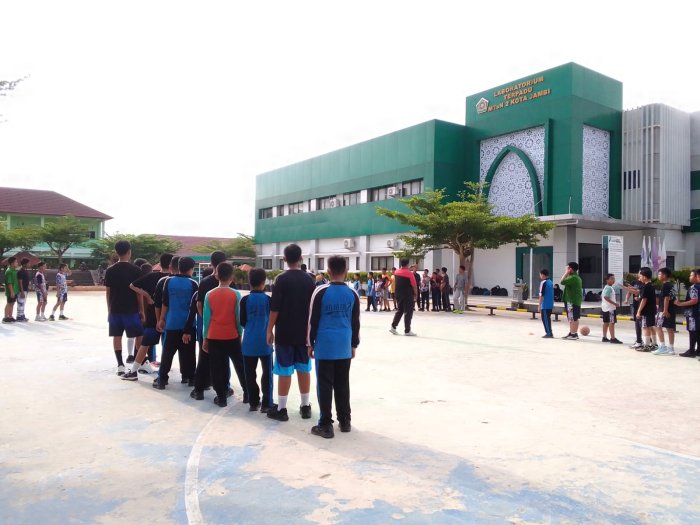 Kota Jambi (MTsN 2) - Latihan rutin basket putra kembali digelar di MTsN 2 Kota Jambi pada Kamis (9/10/2025) sore. Kegiatan ini merupakan bagian dari upaya madrasah dalam membina keterampilan siswa di bidang olahraga, khususnya cabang bola basket. Melalui latihan ini, madrasah berupaya meningkatkan kemampuan teknis dan kerja sama tim para siswa.