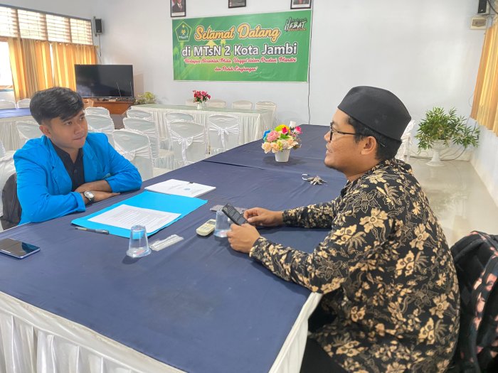 Kota Jambi (MTsN 2) - MTsN 2 Kota Jambi kembali menjadi lokasi kolaborasi akademik dengan menerima kunjungan mahasiswa dari Universitas Islam Negeri (UIN) Sulthan Thaha Saifuddin Jambi. Pada Rabu, 15 Oktober 2025, Tedy Christiyanto, mahasiswa Program Studi Manajemen Pendidikan Islam Fakultas Tarbiyah dan Keguruan, melakukan wawancara khusus dengan Wakil Kepala Bidang Hubungan Masyarakat MTsN 2 Kota Jambi, Wahid Kurniawan, S.Pd.
