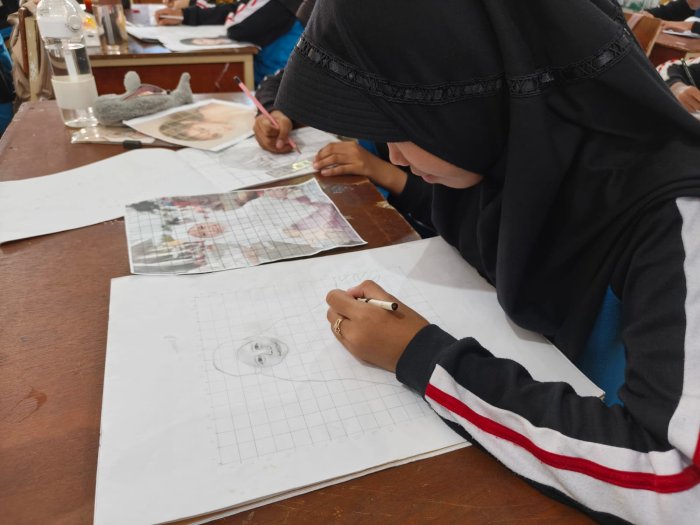 Pitriati, M.Pd. menyampaikan bahwa pembelajaran menggunakan teknik grid tidak hanya melatih keterampilan menggambar, tetapi juga menumbuhkan kemampuan siswa dalam mengamati detail serta memperhitungkan ukuran secara cermat. "Dengan cara ini, siswa belajar bahwa seni juga membutuhkan logika dan ketepatan," ujarnya saat memberikan arahan kepada siswa.