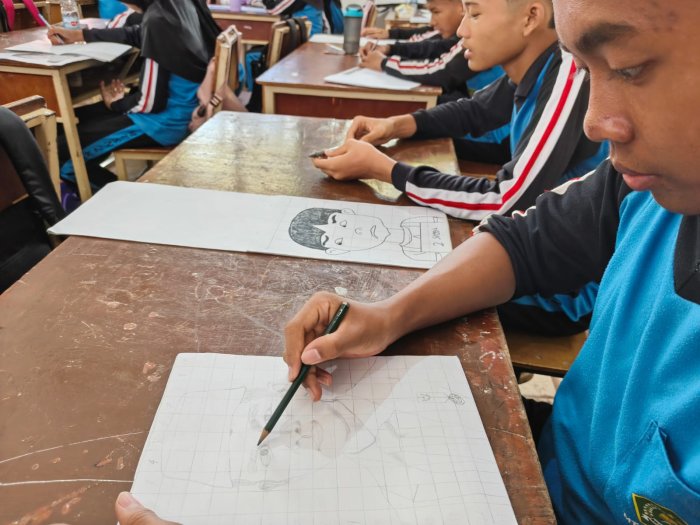 Dalam pembelajaran tersebut, para siswa diajak memahami cara menggambar dengan memperhatikan perbandingan ukuran yang tepat melalui metode grid. Teknik ini bertujuan membantu siswa menyalin objek secara proporsional, sekaligus melatih ketelitian dan kesabaran mereka. Sepanjang kegiatan, siswa tampak antusias memperhatikan penjelasan serta contoh yang diberikan oleh guru, kemudian mencoba menerapkannya secara langsung di atas kertas gambar masing-masing.