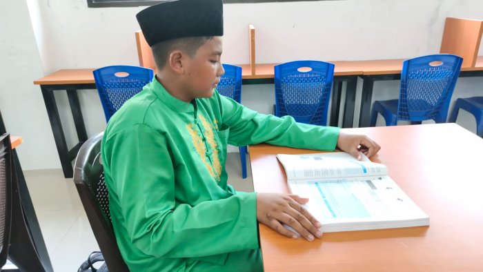 Salah satu siswa tampak serius membaca buku pelajaran. Ia mengungkapkan bahwa dirinya sedang mempersiapkan diri menghadapi asesmen yang akan datang. Hal ini menunjukkan adanya kesadaran di kalangan siswa untuk meningkatkan pemahaman materi pelajaran melalui sumber bacaan yang tersedia di perpustakaan.