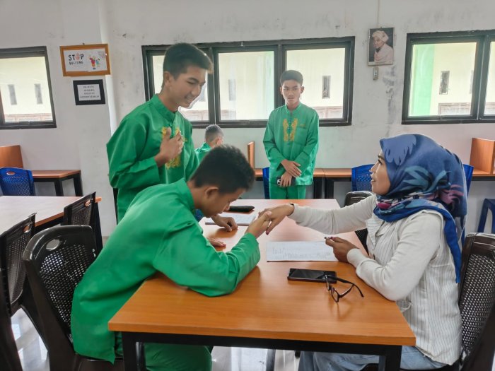 Kota Jambi (MTsN 2) - Beberapa siswa kelas 9J MTsN 2 Kota Jambi melaksanakan kegiatan wawancara langsung dengan staf perpustakaan madrasah pada Jumat, 17 Oktober. Kegiatan ini merupakan bagian dari tugas mata pelajaran Bahasa Indonesia dengan tema "Taman Baca" sebagai sarana literasi di lingkungan pendidikan.
