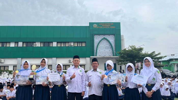 Kota Jambi (MTsN 2 Kota Jambi) — MTsN 2 Kota Jambi kembali menunjukkan komitmennya dalam memberikan penghargaan kepada siswa-siswi berprestasi. Usai pelaksanaan upacara bendera pada Senin pagi, dilakukan prosesi pemberian piagam, piala, dan medali secara simbolis oleh Kepala Madrasah kepada para siswa yang telah mengharumkan nama madrasah di berbagai ajang kompetisi akademik dan non-akademik.