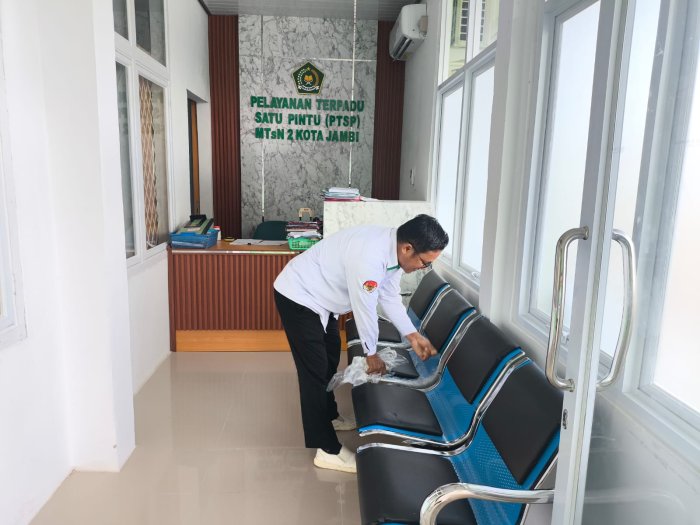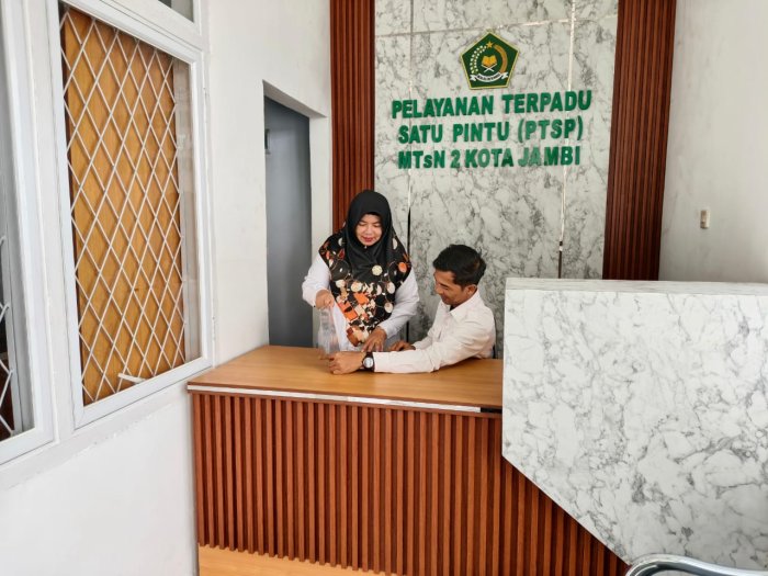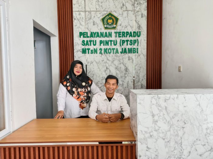 Dengan desain yang bersih dan fungsional, ruang PTSP menampilkan wajah baru MTsN 2 Kota Jambi dalam memberikan pelayanan prima. Dinding berwarna netral, pencahayaan yang terang, serta tata ruang yang tertata rapi menciptakan suasana nyaman bagi siswa dan tamu yang datang.
