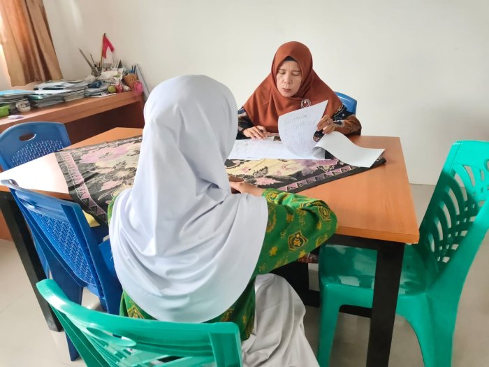 Kota Jambi (MTsN 2) - Seorang siswi MTsN 2 Kota Jambi menjalani sesi bimbingan individu bersama Guru Bimbingan dan Konseling (BK), Mimiyati, S.Pd, pada Kamis, 23 Oktober 2025. Sesi ini dilakukan untuk membantu siswi yang tengah menghadapi masalah. Dalam suasana yang tenang dan penuh empati, siswi tersebut diberikan ruang aman untuk mencurahkan isi hati serta mendapatkan arahan yang membangun dari guru BK.