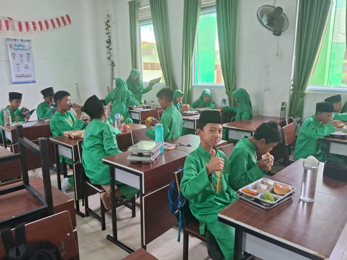 Kota Jambi (MTsN 2) - Program MBG (Madrasah Berbasis Gizi) kembali menyapa siswa-siswi MTsN 2 Kota Jambi, kali ini bersama kelas 7F. Kegiatan berlangsung lancar dan penuh kehangatan di ruang makan madrasah. Menu hari ini terdiri dari roti burger berisi ayam goreng tepung, irisan timun segar, dan daun selada, disajikan dalam omprengan yang bersih dan praktis. Selain itu, siswa juga menerima bungkusan tambahan berisi susu, telur rebus, dan snack sejenis biskuit.
