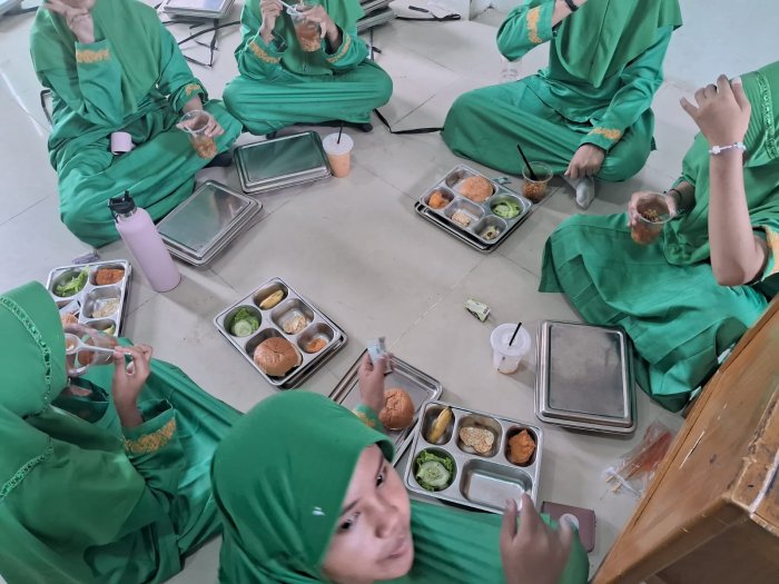 Suasana makan bersama terasa akrab dan menyenangkan. Siswa duduk tertib, saling berbagi cerita, dan menikmati hidangan yang telah disiapkan. Program MBG bukan hanya tentang asupan gizi, tetapi juga tentang membangun kebiasaan hidup sehat dan memperkuat hubungan sosial antar siswa.