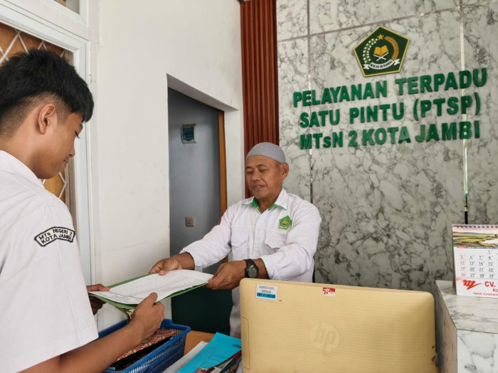 Kota Jambi (MTsN 2) - — Suasana ruang Pelayanan Terpadu Satu Pintu (PTSP) MTsN 2 Kota Jambi tampak hidup pada Senin (27/10/2025) pagi ini. Tampak siswa mendatangi meja pelayanan untuk mengurus berbagai keperluan administrasi. Petugas PTSP melayani dengan sigap dan ramah, memberikan arahan yang jelas kepada setiap siswa yang datang. Proses pelayanan berlangsung tertib dan efisien, mencerminkan semangat profesionalisme yang terus dibangun sejak ruang PTSP resmi diaktifkan beberapa waktu lalu.