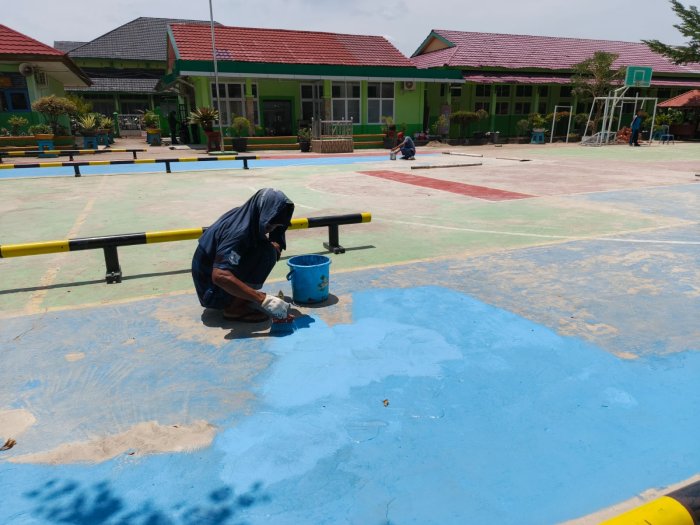 Kota Jambi (MTsN 2) - Proses pengecatan lapangan MTsN 2 Kota Jambi memasuki hari kedua dengan progres yang semakin terlihat. Warna merah, biru, dan hijau mulai membaur di permukaan lapangan, memberikan nuansa ceria dan segar bagi lingkungan madrasah.