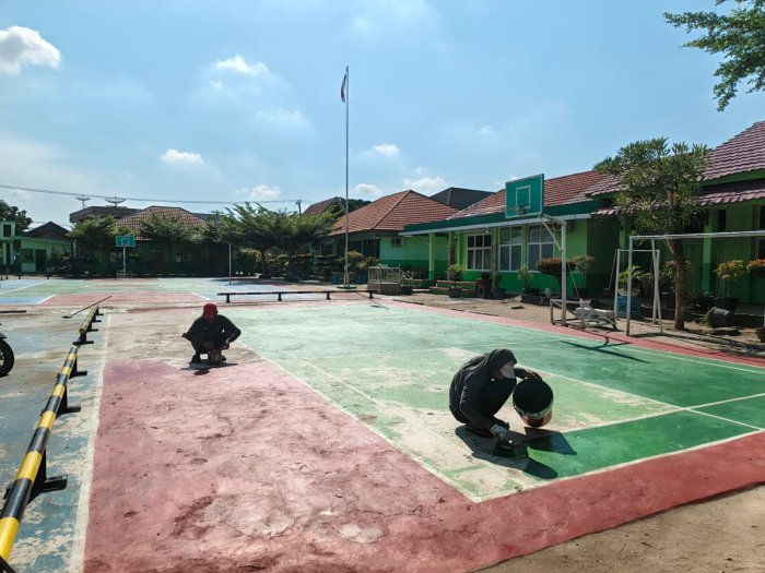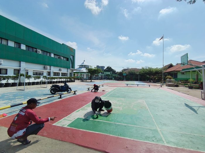 Kota Jambi (MTsN 2 Kota Jambi) — Proses pengecatan lapangan madrasah MTsN 2 Kota Jambi hampir rampung. Sabtu dan Minggu ini, pekerjaan pengecatan telah memasuki tahap finishing dengan hasil yang tampak indah dan segar dipandang mata. Warna merah, biru, dan hijau menyelimuti permukaan lapangan, menciptakan tampilan yang lebih hidup dan representatif sebagai ruang kegiatan utama madrasah.