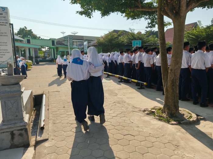 Pelaksanaan upacara berlangsung di halaman madrasah pada pagi hari. Namun, cuaca yang cukup panas membuat beberapa siswa mengalami keluhan fisik ringan seperti pusing dan lemas. Kondisi ini segera direspons oleh Tim Palang Merah Remaja (PMR) MTsN 2 Kota Jambi, yang telah bersiaga sejak awal kegiatan. Tim PMR dengan sigap memberikan pertolongan pertama kepada siswa yang membutuhkan, di antaranya dengan memandu mereka ke ruang UKS untuk mendapatkan perawatan lebih lanjut, seperti pemberian obat dan pengolesan minyak kayu putih.