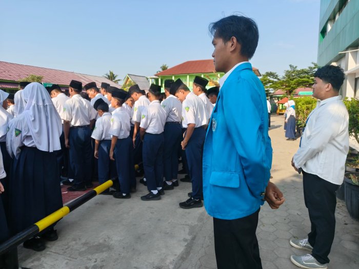 Kota Jambi (MTsN 2) - MTsN 2 Kota Jambi kembali melaksanakan upacara bendera rutin hari Senin (3/11/2025) sebagai bagian dari pembinaan karakter dan kedisiplinan siswa. Dalam pelaksanaan upacara kali ini, mahasiswa Pengenalan Lapangan Persekolahan (PLP) dari Universitas Islam Negeri Sulthan Thaha Saifuddin (UIN STS) Jambi turut berpartisipasi, khususnya dalam membantu mengkoordinir peserta agar tertib dan sesuai dengan susunan acara.