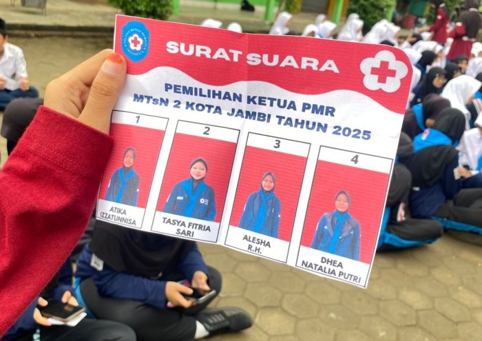 Kota Jambi (MTsN 2) - Latihan rutin Palang Merah Remaja (PMR) MTsN 2 Kota Jambi pada Selasa, 4 November 2025, berlangsung dengan suasana berbeda dari biasanya. Pada kesempatan kali ini, agenda utama yang diusung adalah pemilihan ketua dan wakil ketua PMR untuk periode 2025/2026. Kegiatan ini menjadi bagian dari upaya pembelajaran demokrasi serta regenerasi kepemimpinan di lingkungan sekolah.