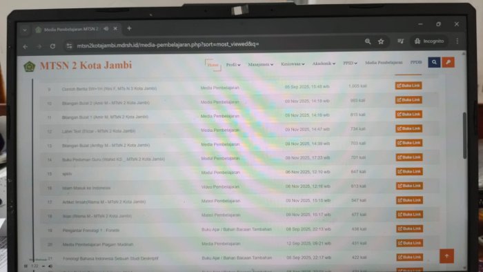 Kota Jambi (MTsN 2) - Pada 10 November 2025, hasil rekapitulasi media pembelajaran yang dipublikasikan di Web Madrasah Negeri se-Provinsi Jambi menunjukkan bahwa media pembelajaran guru MTsN 2 Kota Jambi mendominasi daftar 20 media terpopuler. Media pembelajaran yang dihasilkan meliputi modul interaktif, video edukatif, materi ajar, serta perangkat ajar. Beragam konten ini dirancang untuk mendukung proses belajar mengajar yang lebih kreatif dan komunikatif di lingkungan madrasah.