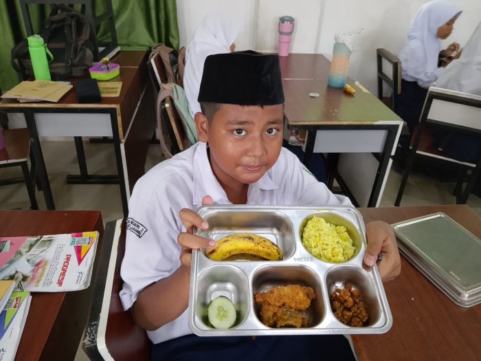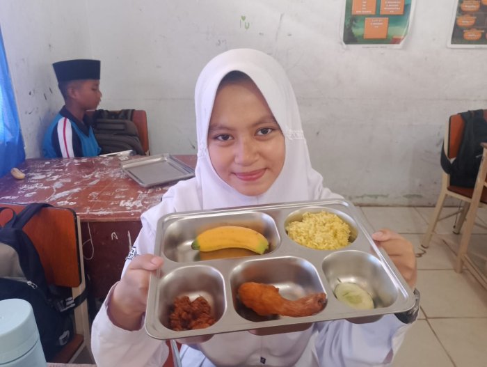 Pada kesempatan tersebut, para siswa mendapatkan menu bergizi yang terdiri dari nasi kuning, ayam tepung, orek tempe, irisan timun, dan buah pisang sebagai hidangan penutup. Menu ini dipilih tidak hanya untuk memenuhi kebutuhan gizi siswa, tetapi juga mengandung makna simbolis. Nasi kuning, yang sering dihidangkan dalam perayaan, menjadi lambang rasa syukur dan harapan. Sementara ayam tepung dan orek tempe memberikan asupan protein yang penting bagi pertumbuhan dan konsentrasi siswa selama proses belajar.