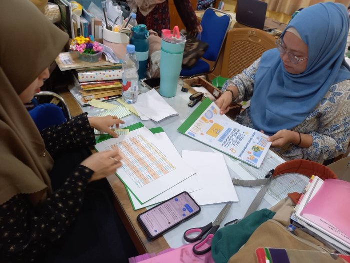 Di ruang kerja, Ketua ASAS Risma Mawaddah, S.Pd bersama Sekretaris ASAS Siti Fatimah Jufri, S. Pd tampak bekerja secara intensif. Mereka menjilid dokumen daftar hadir peserta dan menyusun berkas administrasi lain yang diperlukan. Suasana kerja di ruang panitia terlihat serius, dengan tumpukan kertas dan aktivitas yang terorganisir, menandakan komitmen tim dalam mempersiapkan ujian.