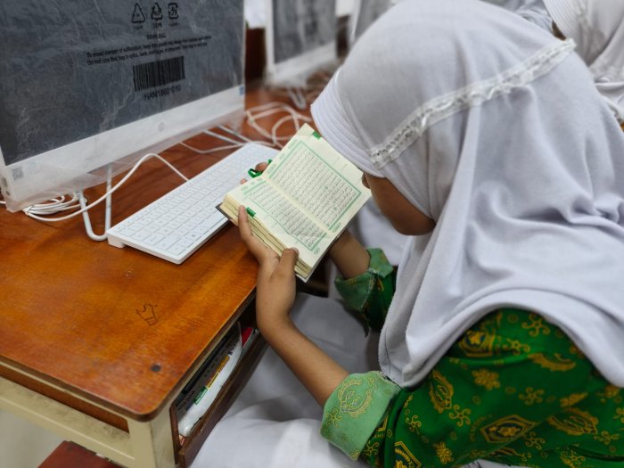 Para siswa membaca ayat-ayat suci Al-Qur'an secara bersamaan. Meskipun berada di ruang yang identik dengan perangkat digital, lantunan ayat suci tetap terdengar lembut dan memberikan suasana khidmat. Kegiatan ini bukan sekadar rutinitas, melainkan juga upaya untuk menghadirkan keberkahan dalam setiap proses belajar mengajar.