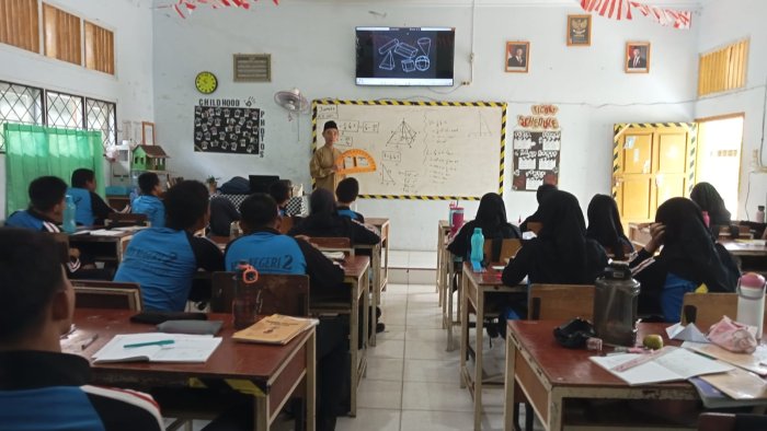 Menariknya, pada layar smart TV di depan kelas, ditampilkan gambar teknik dan bangun ruang seperti tabung, balok, dan komponen mekanik berbentuk roda gigi atau pulley. Dimensi seperti diameter, jari-jari, dan tinggi turut dijelaskan, memperkuat pemahaman visual siswa terhadap konsep volume dan bentuk geometris.