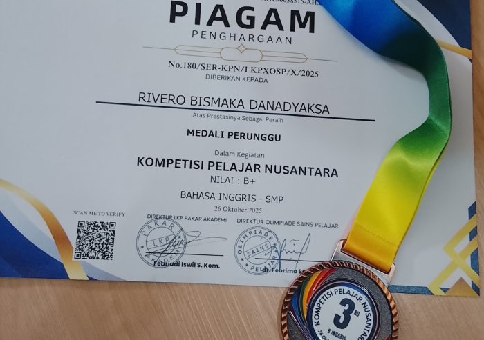 Kota Jambi (MTsN 2) - Semangat juang siswa MTsN 2 Kota Jambi kembali berbuah manis. Rivero Bismaka Danadyaksa, siswa kelas 7E, berhasil mengharumkan nama madrasah dengan meraih Juara 3 dalam Kompetisi Pelajar Nusantara bertema Bahasa Inggris. Ajang bergengsi yang diselenggarakan oleh Pakar Akademi Nasional ini berlangsung secara online dan diikuti oleh pelajar dari seluruh penjuru Indonesia.