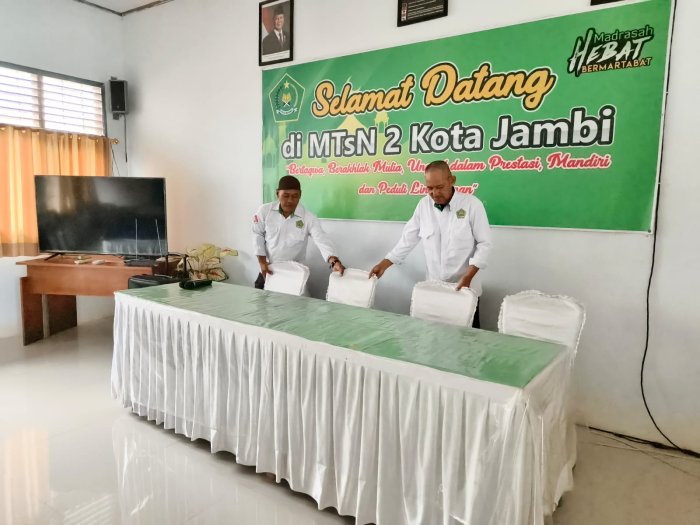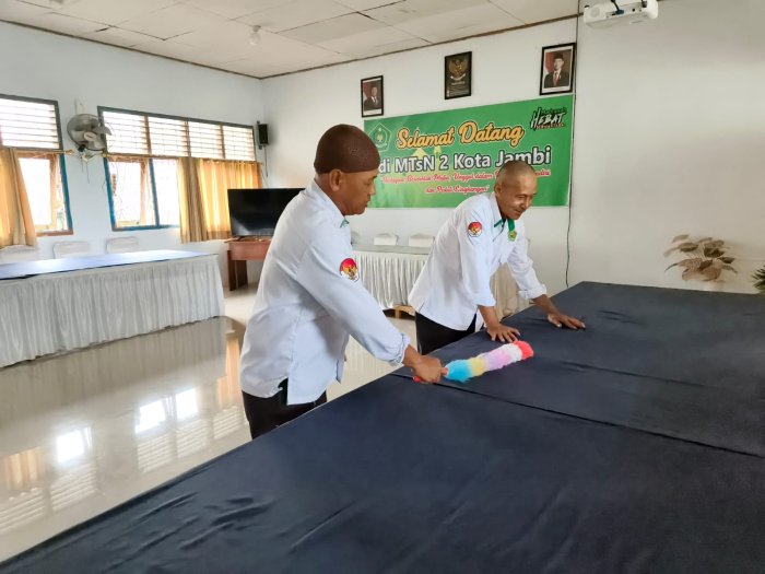 Selain koordinasi internal, tim persiapan juga melakukan penataan ruang serbaguna yang akan menjadi lokasi utama kegiatan. Ruangan tersebut dipersiapkan dengan tata letak yang nyaman, fasilitas presentasi yang memadai, serta dekorasi yang menonjolkan identitas MTsN 2 Kota Jambi. Upaya ini dilakukan agar tamu dari Kemenag Kota Batam mendapatkan kesan positif dan merasakan keramahan tuan rumah.