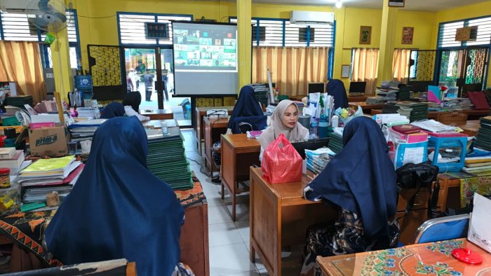 Kota Jambi (MTsN 2 Kota Jambi) — Majelis guru MTsN 2 Kota Jambi mengikuti kegiatan Zoom Meeting nasional yang membahas terbitnya Keputusan Menteri Agama Republik Indonesia (KMA RI) Nomor 1503 Tahun 2025 tentang perubahan atas KMA Nomor 450 Tahun 2024 mengenai Pedoman Implementasi Kurikulum pada RA, MI, MTs, MA, dan MAK. Kegiatan ini dilaksanakan pada Rabu pagi mulai pukul 08.00 WIB hingga selesai, bertempat di ruang majelis guru.