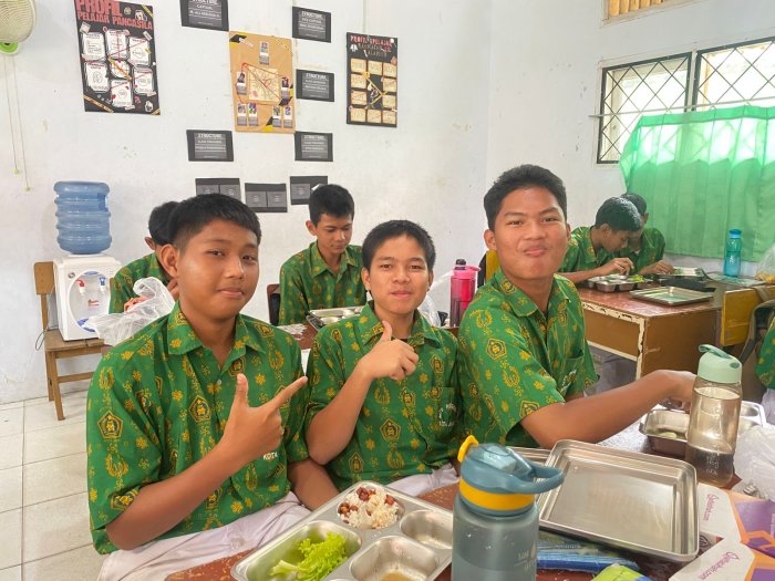 Salah satu siswa kelas 9G, Rezel, menyampaikan kesannya terhadap menu hari ini. “Ayam lada hitamnya enak banget, nggak pedas berlebihan dan dagingnya empuk. Pas banget buat makan siang setelah belajar,” ujarnya sambil tersenyum puas.