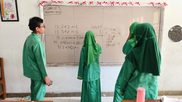 Suasana kelas terlihat aktif dan penuh semangat saat para siswa bekerja sama memecahkan soal-soal Matematika di papan tulis. Setiap siswa mendapat kesempatan untuk menuliskan langkah-langkah penyelesaian soal, sementara teman-teman lain memberikan masukan dan dukungan. Proses ini tidak hanya melatih kemampuan akademik, tetapi juga memperkuat interaksi sosial dan kerja sama di antara siswa.