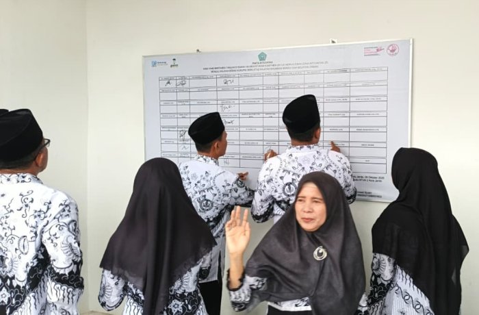 Kota Jambi (MTsN 2) - Pada Selasa, 25 November 2025, guru dan tenaga kependidikan (tendik) MTsN 2 Kota Jambi mengadakan kegiatan penandatanganan Pencanangan Komitmen Zona Integritas (ZI) menuju Wilayah Bebas dari Korupsi (WBK) dan Wilayah Birokrasi Bersih Melayani (WBBM). Acara ini berlangsung setelah upacara peringatan Hari Guru Nasional dan dipusatkan di depan Laboratorium Terpadu madrasah.