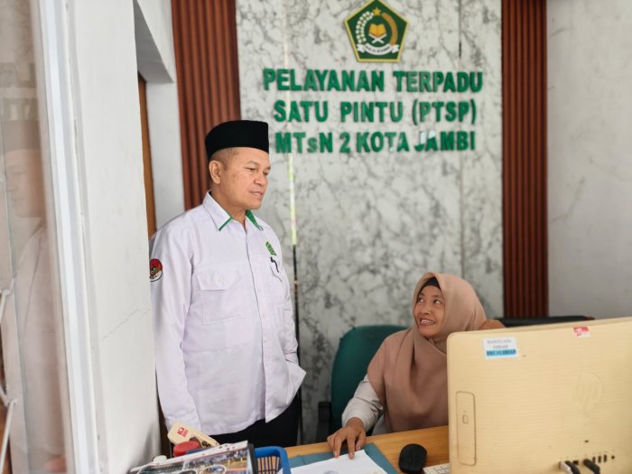 Kota Jambi (MTsN 2) - Kepala MTsN 2 Kota Jambi, Drs. Ahmad Syukri, melakukan peninjauan langsung ke ruang Pelayanan Terpadu Satu Pintu (PTSP) pada Selasa (2/12/2026). Dalam kunjungan tersebut, beliau berdialog dengan petugas PTSP, Mujinah, mengenai pelayanan, fasilitas, serta rencana pengembangan teknologi di ruang layanan.