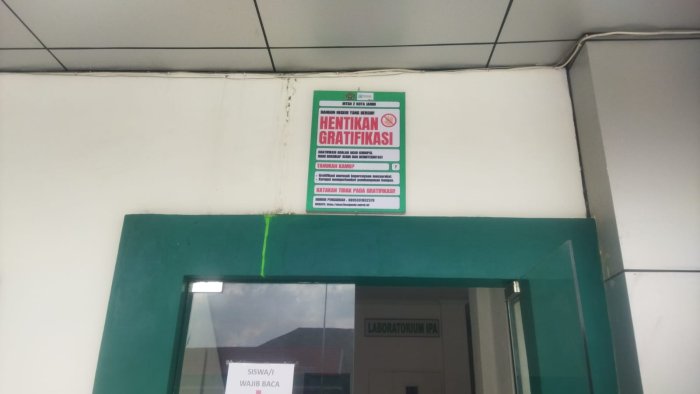 Rambu tersebut dipasang di pos gerbang masuk, laboratorium, Pelayanan Terpadu Satu Pintu (PTSP), serta ruang guru. Kehadiran rambu ini menjadi simbol sekaligus pengingat bagi seluruh warga madrasah dan masyarakat bahwa MTsN 2 Kota Jambi menolak segala bentuk gratifikasi dalam pelayanan maupun aktivitas pendidikan.