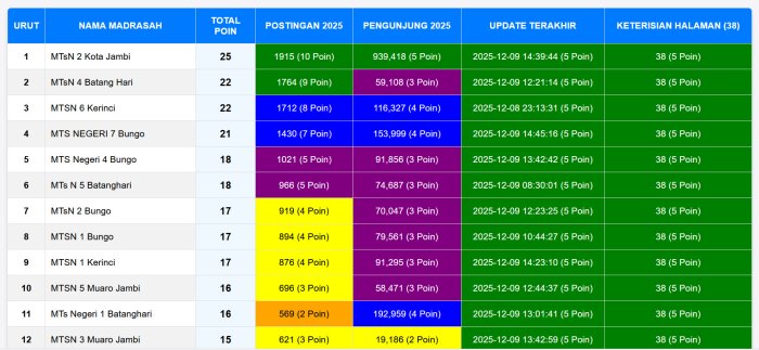Kota Jambi (MTsN 2) - Menjelang hari terakhir proses penilaian keaktifan website madrasah negeri se-Provinsi Jambi yang dijadwalkan pada Rabu, 10 Desember 2025, website resmi MTsN 2 Kota Jambi menunjukkan konsistensi sebagai yang terbaik. Berdasarkan pemantauan pada Selasa, 9 Desember 2025, situs MTsN 2 Kota Jambi masih mempertahankan poin keaktifan tertinggi dibandingkan seluruh madrasah negeri dari jenjang MIN, MTsN, hingga MAN di wilayah Jambi.
