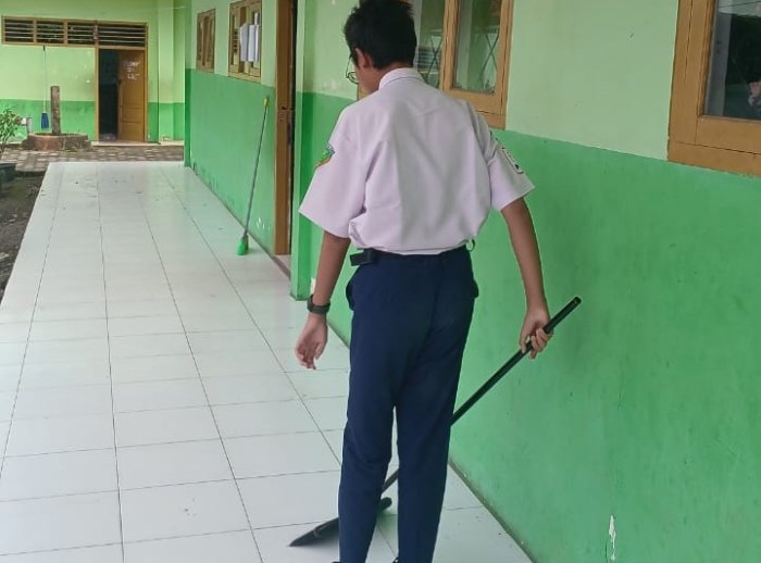 Siswa tampak membersihkan lingkungan kelas, lantai disapu hingga bersih. Aktivitas ini bukan sekadar rutinitas, melainkan wujud kepedulian siswa terhadap kenyamanan belajar dan kebersihan lingkungan madrasah.