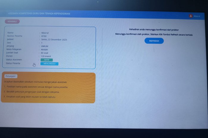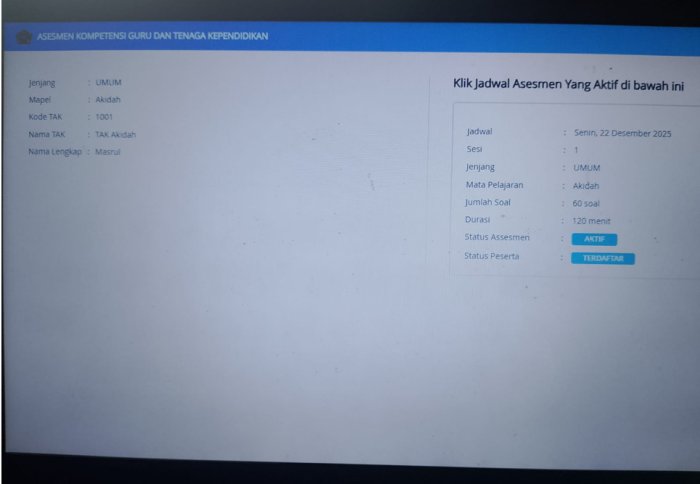 Kota Jambi (MTsN 2) - Pada Senin (22/12/2025) guru Akidah Akhlak MTsN 2 Kota Jambi, Masrul, S.Pd.I, mengikuti Asesmen Kompetensi Guru dan Tenaga Kependidikan (AKGTK) sesi pertama yang dilaksanakan secara daring melalui https://akgtk.kemenag.go.id/.