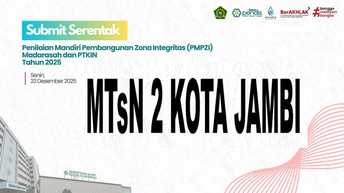 Kota Jambi (MTsN 2) - Tim Zona Integritas (ZI) MTsN 2 Kota Jambi mengikuti kegiatan Submit Serentak Penilaian Mandiri Pembangunan Zona Integritas (PMPZI) yang diselenggarakan oleh Direktorat Jenderal Pendidikan Islam Kementerian Agama Republik Indonesi. Agenda ini dilaksanakan secara daring melalui Zoom Meeting pada Senin, 22 Desember 2025, pukul 09.00–10.05 WIB.