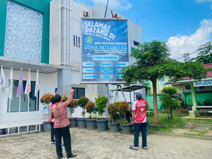 Kota Jambi (MTsN 2) - MTsN 2 Kota Jambi kembali menegaskan komitmennya dalam membangun budaya kerja yang bersih dan melayani dengan memasang baliho besar bertuliskan "Zona Integritas" di area depan gedung madrasah pada Rabu (24/12/2025). Baliho ini menjadi simbol bahwa madrasah telah menetapkan diri sebagai kawasan bebas dari korupsi dan birokrasi yang bersih serta berorientasi pada pelayanan publik. Lokasi pemasangan yang strategis di depan gedung madrasah membuat baliho ini mudah terlihat oleh seluruh warga madrasah maupun tamu yang berkunjung ke MTsN 2 Kota Jambi.