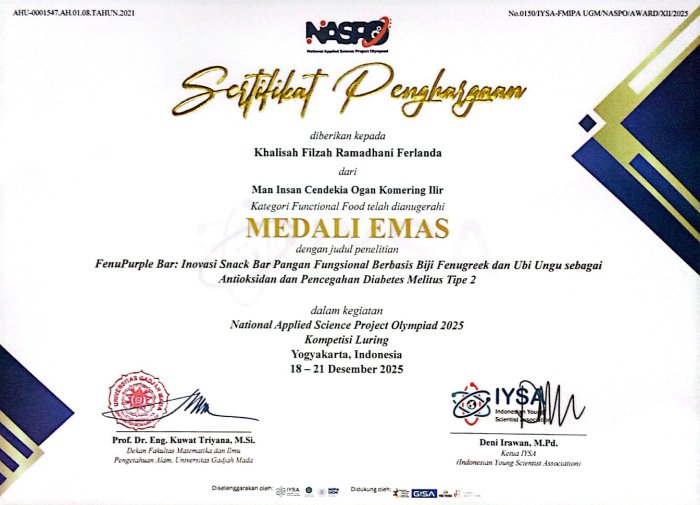 "FenuPurple Bar" dinilai unggul oleh dewan juri karena menggabungkan potensi bahan alami dengan pendekatan ilmiah yang kuat. Sertifikat penghargaan ditandatangani langsung oleh Prof. Dr. Eng. Kuwat Triyana, M.Si., Dekan FMIPA Universitas Gadjah Mada, dan Deni Irawan, M.Pd., Ketua Indonesian Young Scientist Association (IYSA).
