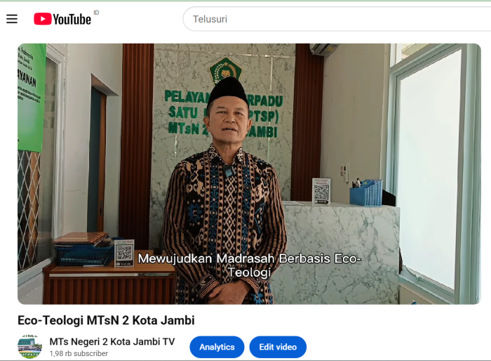 Tema eco-teologi dalam video ini diambil ketika masa libur semester. Guru dan Tenaga Kependidikan (GTK) MTsN 2 Kota Jambi tetap semangat dan setia menjaga serta merawat madrasah meskipun sedang libur. Aktivitas mereka menjadi inspirasi bahwa kepedulian terhadap lingkungan sekolah adalah bagian dari pengabdian yang tidak mengenal waktu.