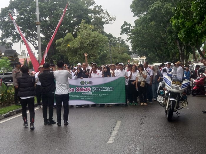 Meski langit tampak mendung dan jalanan basah akibat hujan sebelumnya, semangat peserta tidak surut. Suasana pagi yang sejuk justru menambah kenyamanan dalam berjalan bersama, sambil sesekali bersenda gurau dan menyapa peserta dari satuan kerja lain. Momen ini menjadi potret kebersamaan yang hangat di tengah semangat HAB.
