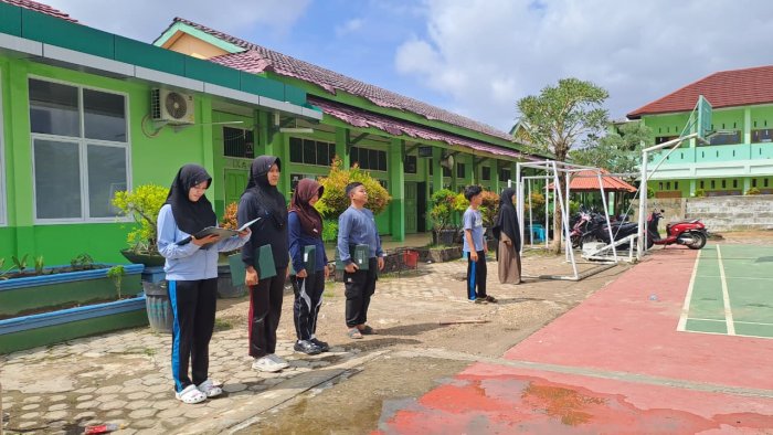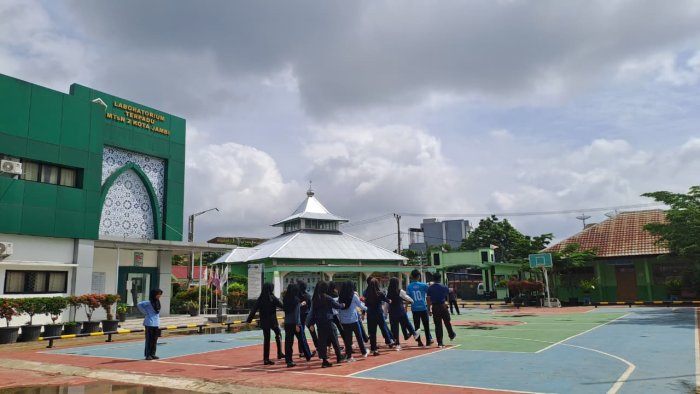 Bangunan hijau madrasah dan Laboratorium Terpadu MTsN 2 Kota Jambi menjadi latar kegiatan, memperkuat kesan edukatif dan religius. Tidak ada suara gaduh, hanya aba-aba tegas dan gerakan serempak yang mendominasi suasana.
