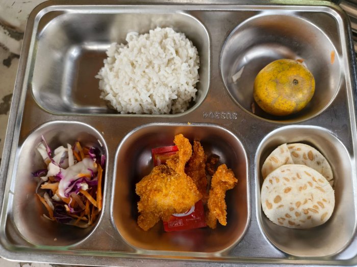 Sejak pagi, paket MBG yang dikirim dari dapur rekanan SPPG Thehok langsung dibagikan kepada seluruh siswa. Menu yang disajikan terdiri dari nasi putih, irisan ayam katsu, sayur kol dan wortel, keripik tempe, serta buah jeruk segar sebagai pelengkap. Hidangan ini dirancang untuk memenuhi kebutuhan gizi seimbang sekaligus memberikan variasi rasa yang menarik.