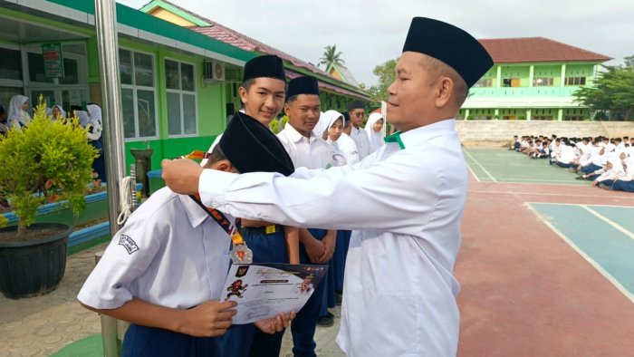 Kepala MTsN 2 Kota Jambi, Drs. Ahmad Syukri, didampingi para wakil kepala dan guru pembina, menyerahkan penghargaan secara langsung kepada siswa.