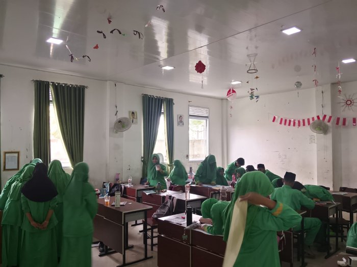 Suasana kelas terlihat hidup. mereka duduk bersama di meja-meja yang dipenuhi kertas, alat tulis, dan karya tipografi. Ada yang menunduk serius menulis, ada pula yang memberi masukan kepada teman sekelompoknya. Semua terlibat aktif dalam proses kreatif.