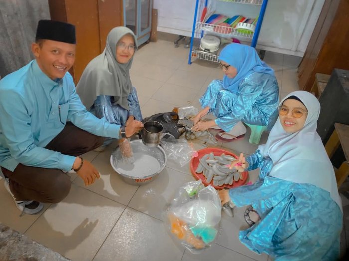 Terlihat berbagai hidangan sederhana tersaji, mulai dari nasi, lauk-pauk, kue tradisional, hingga buah-buahan. Kebersamaan saat makan bersama menciptakan momen hangat yang mempererat rasa persaudaraan di antara siswa maupun guru.