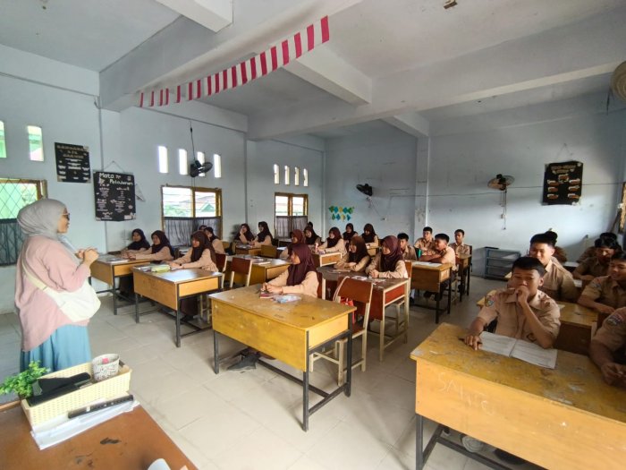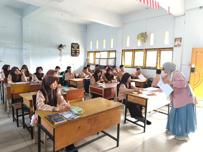Kota Jambi (MTsN 2 Kota Jambi) - Mursyidah J. Parandrengi, mahasiswi Program Magister Pendidikan Matematika Universitas Jambi yang akrab disapa Uci, melaksanakan penelitian di MTsN 2 Kota Jambi. Penelitian ini merupakan bagian dari tugas mata kuliah Penulisan Artikel Ilmiah dengan mengambil sampel siswa kelas IX F. Siswa diminta mengisi soal tipe PISA basic literasi numerasi sebagai bahan analisis awal pengumpulan data untuk mata kuliah tersebut.