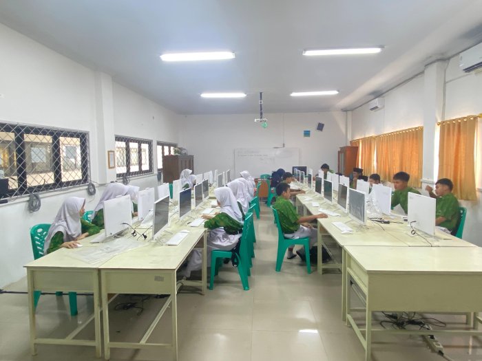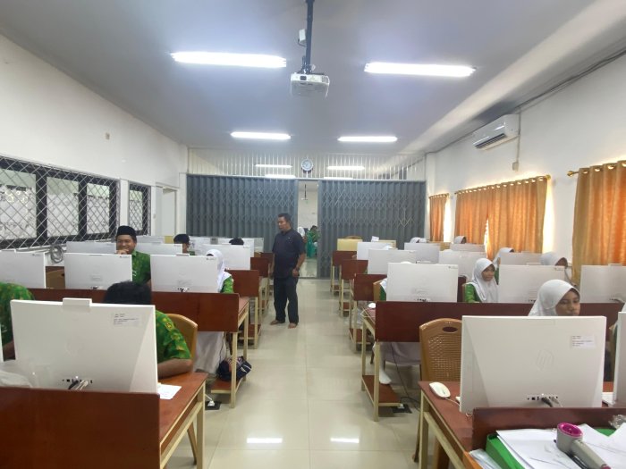 Pelaksanaan berlangsung di laboratorium komputer dengan pengawasan proktor dan teknisi madrasah. Siswa tampak serius dan penuh semangat mengikuti jalannya ujian.